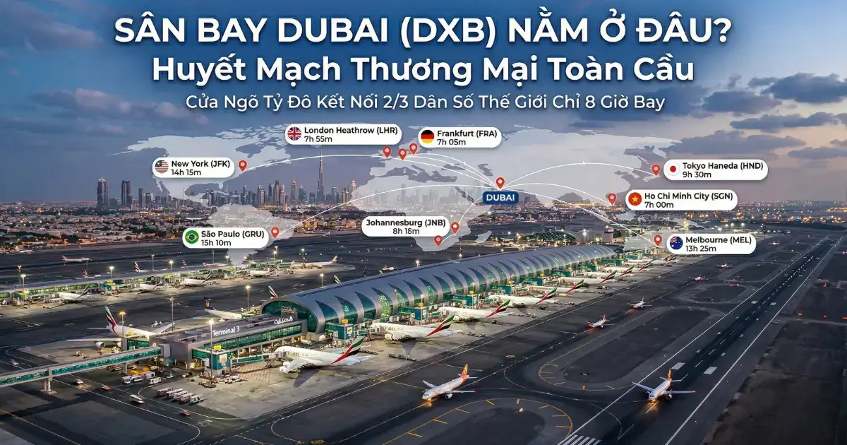 Sân bay Quốc tế Dubai (DXB) không chỉ đơn thuần là một công trình hạ tầng hàng không mà còn là “trái tim” điều phối dòng chảy của chuỗi cung ứng toàn cầu. Tọa lạc tại vị trí đắc địa thuộc quận Al Garhoud, chỉ cách trung tâm tài chính Dubai vài phút di chuyển, DXB sở hữu một lợi thế địa lý mà bất kỳ quốc gia nào cũng khao khát: nằm tại giao lộ của ba châu lục Á – Âu – Phi. Với khả năng tiếp cận 2/3 dân số thế giới chỉ trong vòng 8 giờ bay, sân bay này đã chính thức trở thành “trạm sạc” năng lượng cho thương mại xuyên lục địa, vượt qua nhiều đối thủ sừng sỏ để duy trì vị thế sân bay bận rộn nhất hành tinh về năng lực vận tải quốc tế.